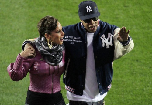 Rapper(说唱歌手) Jay-Z(杰斯) and singer Alicia Keys(艾丽西娅·凯斯) walk off of the field after performing before Game Two of the World Series at Yankee Stadium on October 29, 2009 in the Bronx borough of New York City.