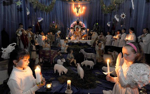 Belarus(白俄罗斯) girls hold candles during a service at the Red Catholic temple on Christmas Eve in Minsk(明斯克,白俄罗斯首都).