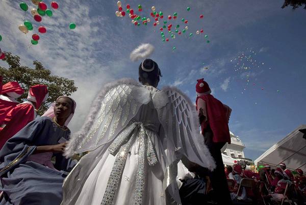 Children wear costumes as they partake in(参与) a Christmas pageant(盛装游行) at the presidential palace on Christmas Eve in Port-au-Prince, Haiti.