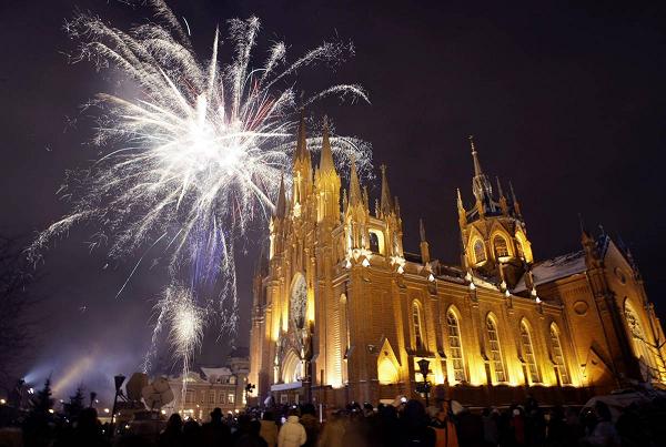 People celebrate Christmas Eve in front of Moscow's Catholic Church(天主教堂) of the Immaculate Conception on Thursday.