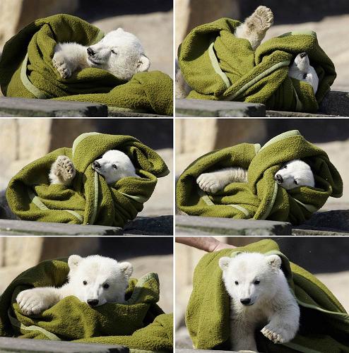 Knut playing with a blanket at his enclosure(圈占地) of the Berlin zoo, March 28, 2007.