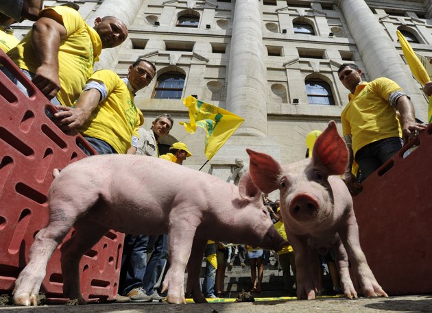 Protesters look at pigs during a protest, organized by the farmer's trade union Coldiretti in front of the Milan's stock exchange July 26, 2011. The farmer's union protested against international speculation of raw material that has caused the increase in price of the animal feed, and they urged the government to protect them. (REUTERS/Paolo Bona)