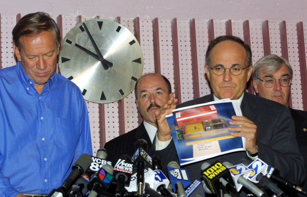 Photo: New York Gov. George Pataki, left, Police Commissioner Bernard Kerik, center rear, and Barry Mawn, head of the the New York office of the FBI, rear right, stand behind New York Mayor Rudy Giuliani as Giuliani holds up a photo of an airliner flight recorder, known as a "black box," as he appeals to the public in New York, Wednesday, Sept. 12, 2001, for help in locating the devices carried on the planes that crashed into the World Trade Center. (AP Photo/David Karp)