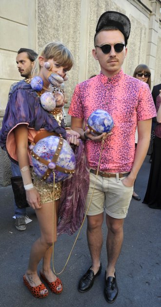 7. Josefine Arnell and Rafal Zajko, artists and designers, pose outside the Prada Spring/Summer 2012 women's collection during Milan Fashion Week September 22, 2011. REUTERS/Paolo Bona (ITALY - Tags: FASHION)