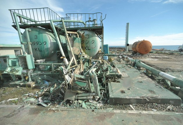 Crushed tanks are seen at the ocean-facing side of the crippled Fukushima Daiichi nuclear power plant in Fukushima prefecture, November 12, 2011. Conditions at Japan's wrecked Fukushima nuclear power plant, devastated by a tsunami in March, were slowly improving to the point where a "cold shutdown" would be possible as planned, officials said on Saturday during a tour of the facility. The nuclear reactor buildings were still surrounded by ...