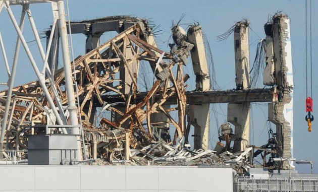 The crippled Fukushima Daiichi nuclear power plant's upper part of the No.3 reactor building is seen from a bus window in Fukushima prefecture, November 12, 2011. Conditions at Japan's wrecked Fukushima nuclear power plant, devastated by a tsunami in March, were slowly improving to the point where a "cold shutdown" would be possible as planned, officials said on Saturday during a tour of the facility. The nuclear reactor buildings were still ...