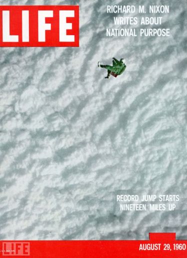 On August 16, 1960, 32-year-old U.S. Air Force Captain Joe Kittinger flew in a helium(氦)-balloon gondola(气球吊篮) to 102,800 feet (roughly 19 miles) above the Earth ... and jumped. His free-fall lasted 4 minutes and 36 seconds. He experienced temperatures approaching minus-100 degrees Fahrenheit. As he fell, Kittinger neared the speed of sound, his pressure-suit-encased(pressure suit: 增压服) body traveling at more than 600 mph before he opened his parachute at 14,000 feet.