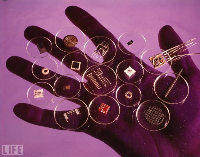 A handful of microelectronic parts in 1960. For the March 10, 1961 issue, LIFE enthused about their future usages, noting "the inside of a TV set may in a decade or two be wonderfully simplified -- no tangle(乱糟糟缠在一起的一团) of wires and tubes, just two or three chips of crystal engraved and etched(蚀刻) like jewelry." Indeed!