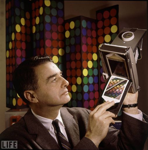 Edwin Land, the president and co-founder of the Polaroid Corporation, demonstrates his company's "60-second film" in 1963. By allowing photographers to see (almost) immediately what they had shot, Polaroid revolutionized photography and foreshadowed(预示), in a way, the advent[(尤指不寻常的人或事)出现, 到来] of digital photography and its unspoken creed of instant gratification.