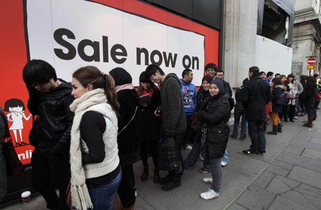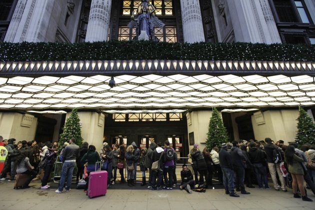 People queue early in the morning outside a department store ahead of it opening for Boxing Day sales in central London, Monday, Dec. 26, 2011. Despite disruptions caused by London's subway drivers striking over a pay dispute, large crowds of shoppers started flooding department stores in London as soon as doors opened early Monday.