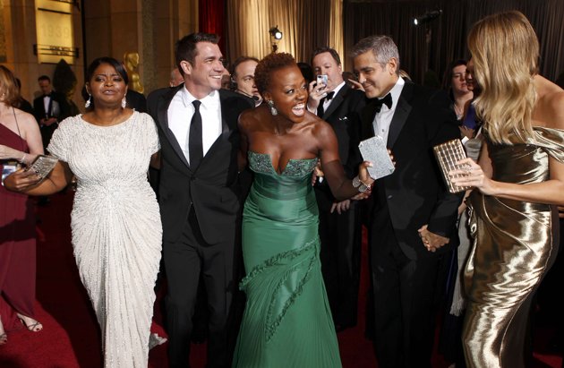 Best supporting actress nominee Octavia Spencer (L) and "The Help" director Tate Taylor (2nd L) watch as best actress nominee Viola Davis (C) jokes with Taylor's girlfriend Stacy Keibler (R) after best actor nominee George Clooney (2nd R) kissed Davis on the red carpet at the 84th Academy Awards in Hollywood, California, February 26, 2012.