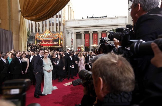 Argentine-French actress Berenice Bejo, best supporting actress nominee for her role in "The Artist," and her husband French director Michel Hazanavicius, best director nominee for the same film, pose for photographers on the red carpet at the 84th Academy Awards in Hollywood, California, February 26, 2012.