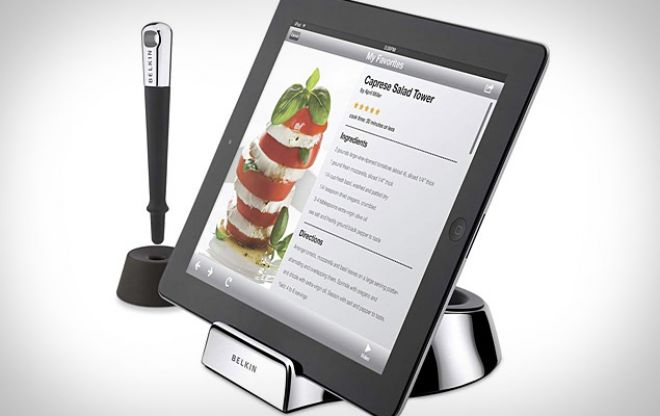 iPads can be super-handy in the kitchen, but do you really want to be touching your tablet with greasy, meaty mitts? We thought not. The Belkin Chef Stand ($40) takes care of the problem by holding your iPad in a chrome-finished stand and providing you with a dedicated stylus that just happens to have magnetic properties so you can turn your iPad 2 on and off without ever touching it. If counterspace is slim, consider the Fridge Mount ($40) or Kitchen Cabinet Mount ($50) instead, and keep everything from Epicurious to ESPN right at your, ummm, stylustips.