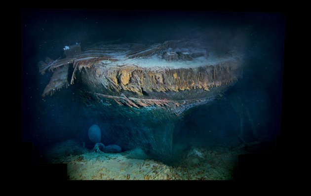 With her rudder(舵) cleaving the sand and two propeller(螺旋推进器) blades peeking from the murk, Titanic’s mangled stern rests on the abyssal plain, 1,970 feet south of the more photographed bow. This optical mosaic combines 300 high-resolution images taken on a 2010 expedition. COPYRIGHT© 2012 RMS TITANIC, INC; Produced by AIVL, Woods Hole Oceanographic Institute.