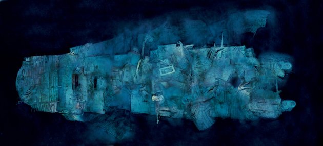 The first complete views of the legendary wreck Titanic’s battered stern(船尾) is captured overhead here. Making sense of this tangle of metal presents endless challenges to experts. Says one, “If you’re going to interpret this stuff, you gotta love Picasso.” COPYRIGHT© 2012 RMS TITANIC, INC; Produced by AIVL, Woods Hole Oceanographic Institute.