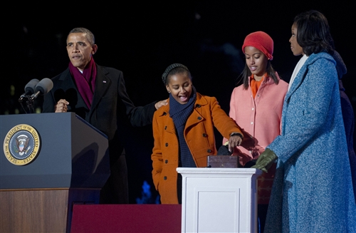 The president was joined by the first lady and their two daughters, Malia, 14, and Sasha, 11, when he led a dramatic countdown before more than 17,000 guests and lit the tree.