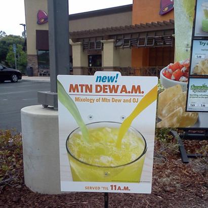 Taco Bell continues to "innovate" its menu options by introducing the MTN Dew A.M., a blended breakfast drink consisting of Mountain Dew and orange juice.