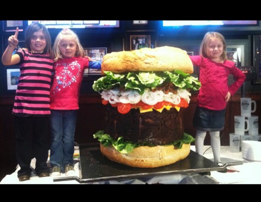 Children stand next to a 338-pound "Absolutely Ridiculous Burger" at the Mallie's Sports Grill in Southgate, Mich. The 3-foot-high sandwich packs 540,000 calories, takes 22 hours to cook and sells for $2,000. Manager Jason Jones says it comes with fries and a drink.