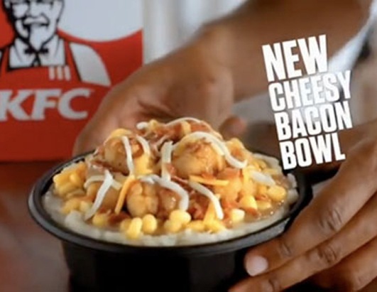 KFC's new Cheesy Bacon Bowl comes with fried chicken, mashed potatoes and gravy, cheese -- and, of course, bacon. The nutritional info for the $3.99 concoction is currently missing from the KFC.com nutrition guide, but its older cohort, the KFC Famous Bowl, packs 680 calories and 31 grams of fat.