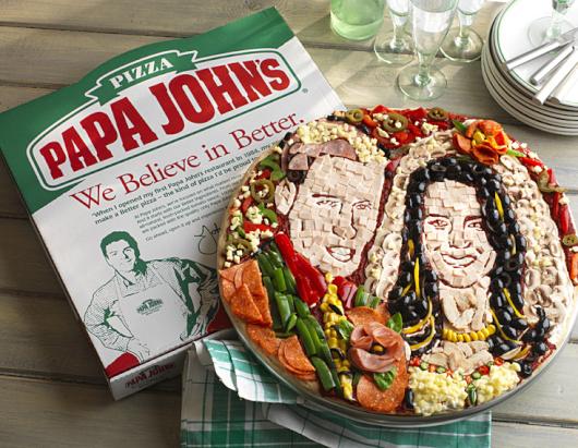 Papa John's commissioned a food artist in the U.K. to create a mosaic pizza portrait of Prince William and Kate Middleton to celebrate their marriage on April 29, 2011. Kate's veil is made of mushrooms and her dress from cheese, while William's morning coat consists of salami and peppers.