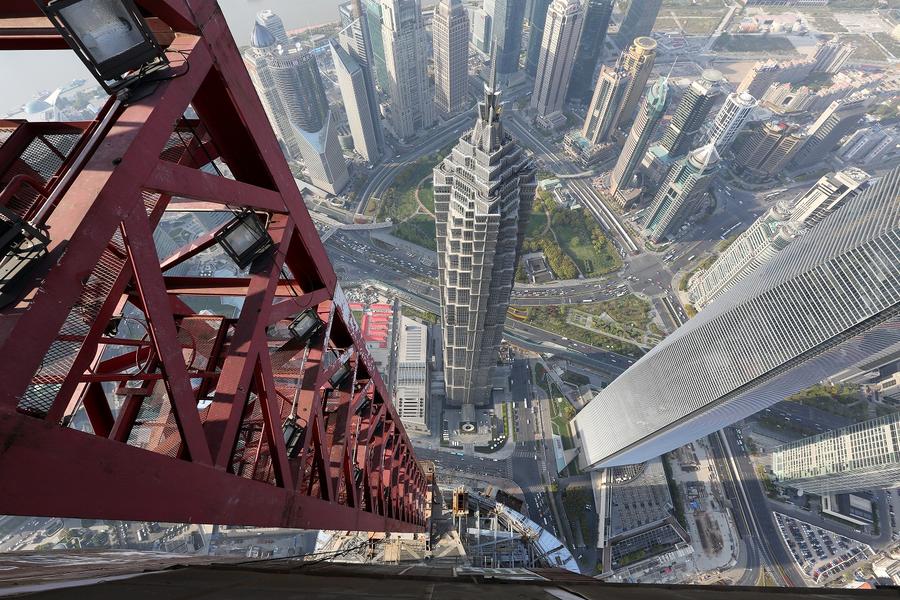 Taken from one of Shanghai Tower's higher levels, the future 'tallest building in China' dwarfs its neighboring structures.