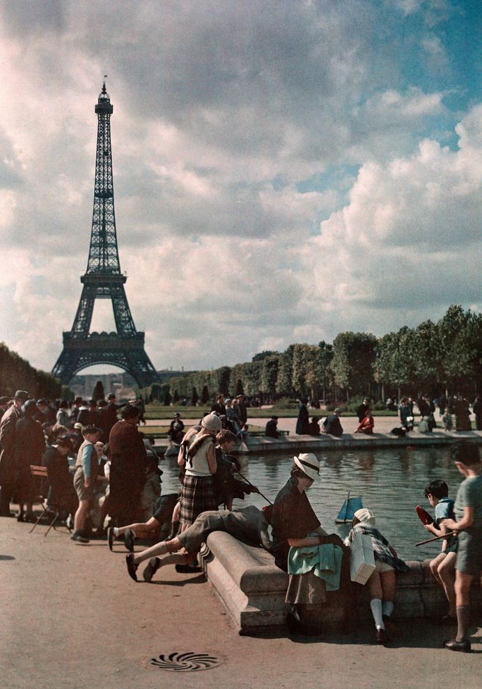 With the Eiffel Tower as backdrop, children sail toy boats in a pond in July 1936.