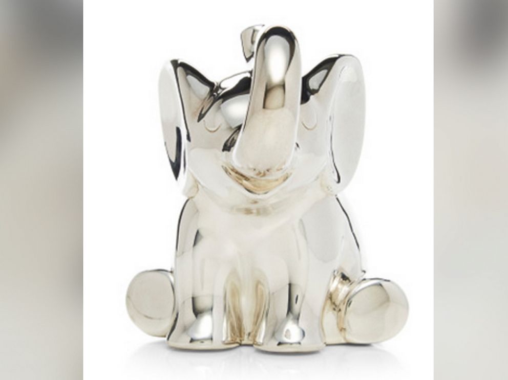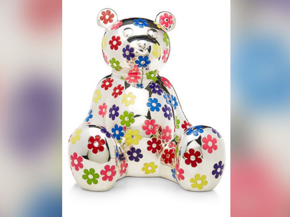 This teddy bear bank is made of sterling silver in London with hand-painted floral enamel by Asprey.
