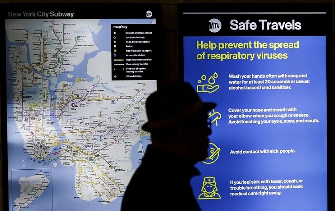A public service announcement related to the coronavirus is seen on screen in the Times Square subway station in New York City as the number of cases in New York state continues to rise.