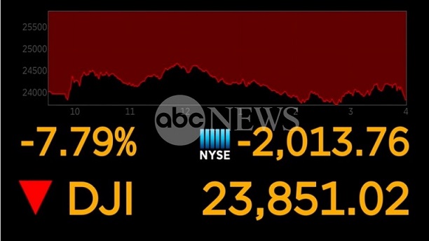 The Dow — which reached record highs in mid-February —- suffered its worst point drop in one day and fell 2,013.76 points or down 7.79% to close at 23,851.02 points Monday. The Dow was down for the 11th time in 13 days of trading.