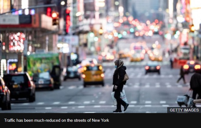 Traffic levels in the city were estimated to be down 35% compared with a year ago. Emissions of carbon monoxide, mainly due to cars, have fallen by around 50% for a couple of days this week according to researchers at Columbia University.