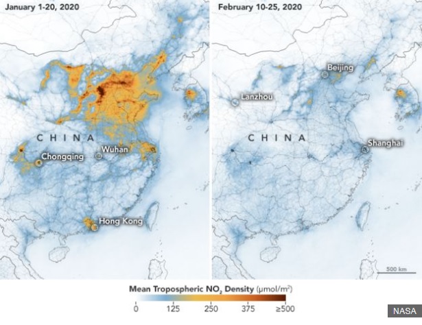 Levels of air pollutants and warming gases over some cities and regions are showing significant drops as coronavirus impacts work and travel.