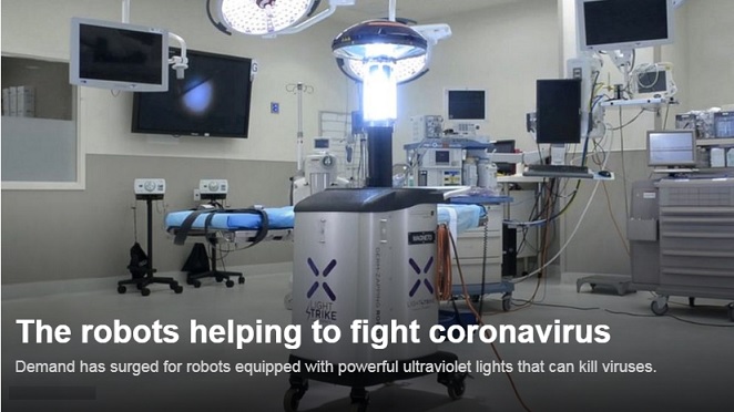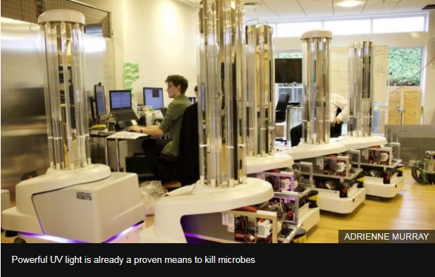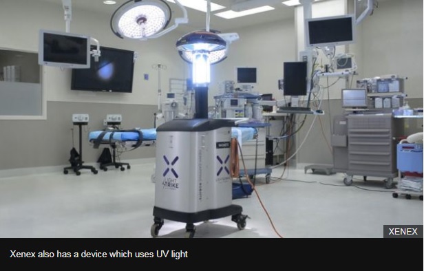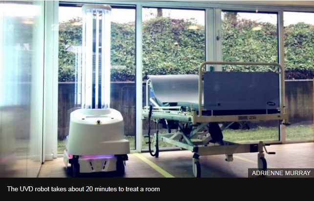 Through a glass window we watch as the self-driving machine navigates a mock-hospital room, where it kills microbes with a zap of ultraviolet light.