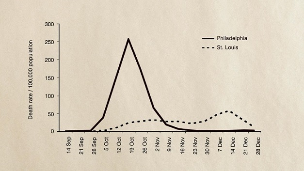 The death rates in Philadelphia and St Louis during the 1918 Spanish flu pandemic demonstrate the importance of social distancing (Credit: National Academy of Sciences USA 2007)