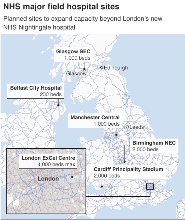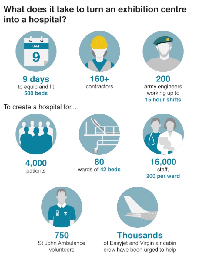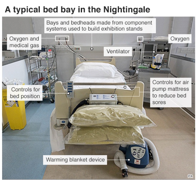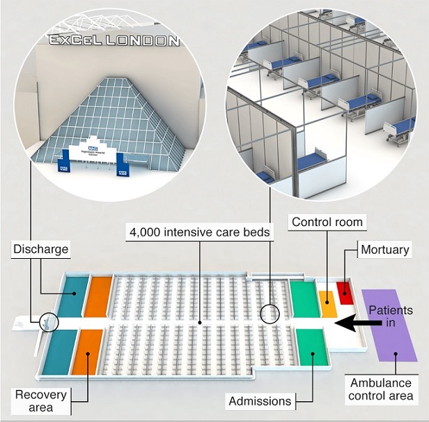 East London's ExCeL exhibition centre, which normally plays host to lifestyle shows, expos and conferences, has been converted into the temporary NHS Nightingale hospital, with space for 4,000 beds.
