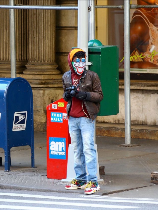 Man with Joker face mask is walking during the coronavirus pandemic in New York, April 1, 2020.
