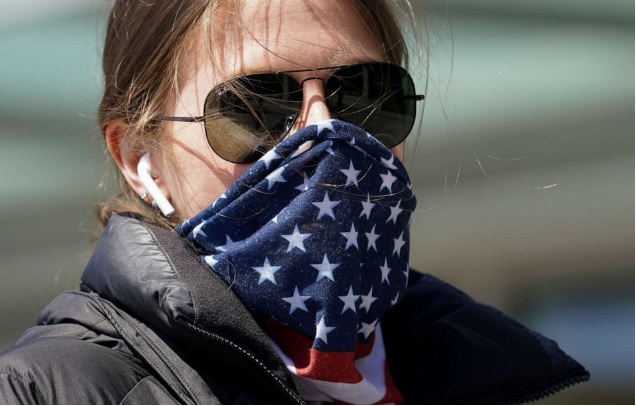 A woman wears a stars and stripes bandana for a face mask, amid the coronavirus disease (COVID-19) fears, in Washington, April 2, 2020.