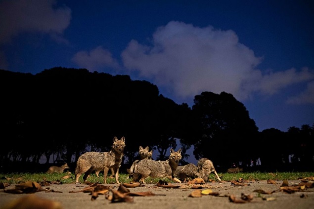 A pack of jackals eat dog food that was left for them by an Israeli woman, at Hayarkon Park in Tel Aviv, Israel, April 11, 2020.