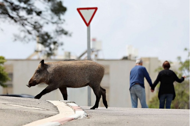 A wild boar roams a street of the Carmel neighborhood, in the northern city of Haifa, Israel, April 11, 2020.