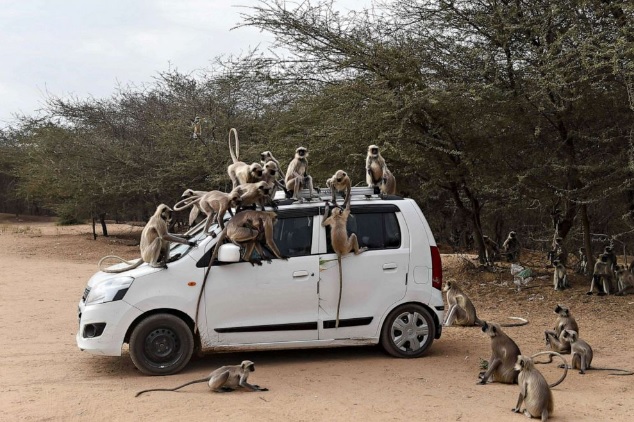 Monkeys climb on a car as they are being fed with potatoes by a resident at Ode village, March 25, 2020, during the first day of a 21-day government-imposed nationwide lockdown due to the COVID-19 pandemic, some 25 kms from Ahmedabad, India.