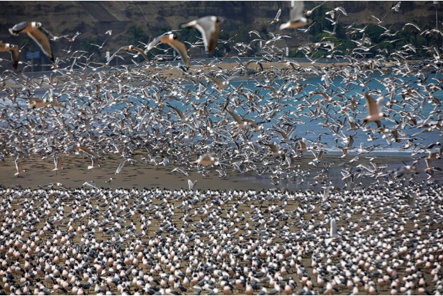 Thousands of birds flock to Agua Dulce beach now largely absent of beachgoers in Lima, Peru, March 24, 2020. The birds began swarming the empty shores since Peru's president declared a state emergency and ordered people to stay home because of the spread of COVID-19. Peru confirmed its first coronavirus case on March 6.