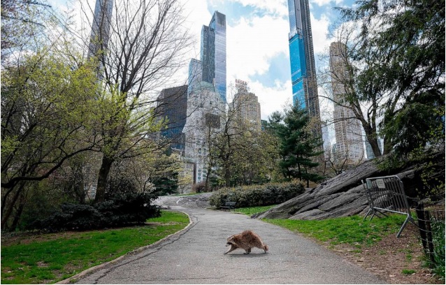 A raccoon walks in almost deserted Central Park, April 16, 2020 in New York City. Gone are the softball games, horse-drawn carriages and hordes of tourists. In their place, pronounced birdsong, solitary walks and renewed appreciation for Central Park's beauty and more room to play for the resident wildlife.