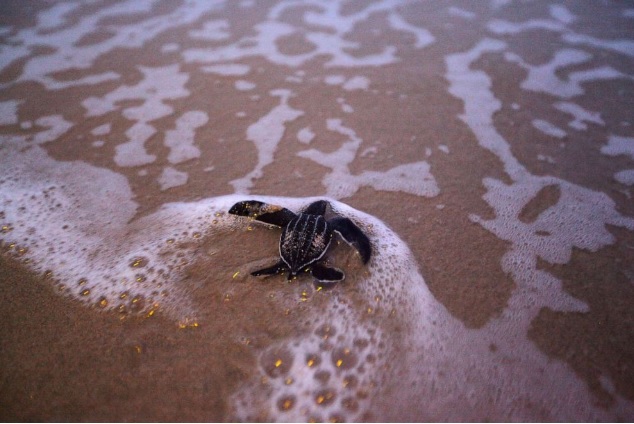 A newly-hatched baby leatherback sea turtle makes its way to the sea for the first time at a beach in Phanga Nga district, Thailand, March 27, 2020.