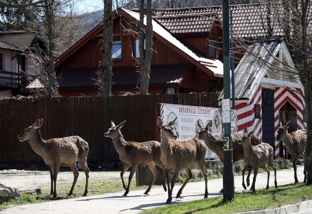 Five female roe deer and a young fawn roam on a nearly-empty sidewalk in Zakopane, southern Poland, April 16, 2020.