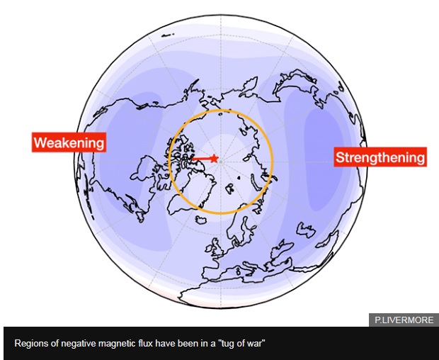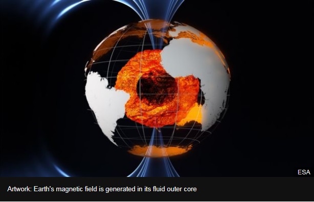 A team, led from Leeds University, says the behaviour is explained by the competition of two magnetic "blobs" on the edge of the Earth's outer core.