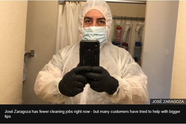 Mr Zaragoza's business has dropped dramatically since the coronavirus pandemic hit the US. Right now, he has only had one cleaning job a day, and needs to take extra precautions including wearing a full body coverall, a mask and gloves, and washing every piece of his cleaning equipment before starting a job.