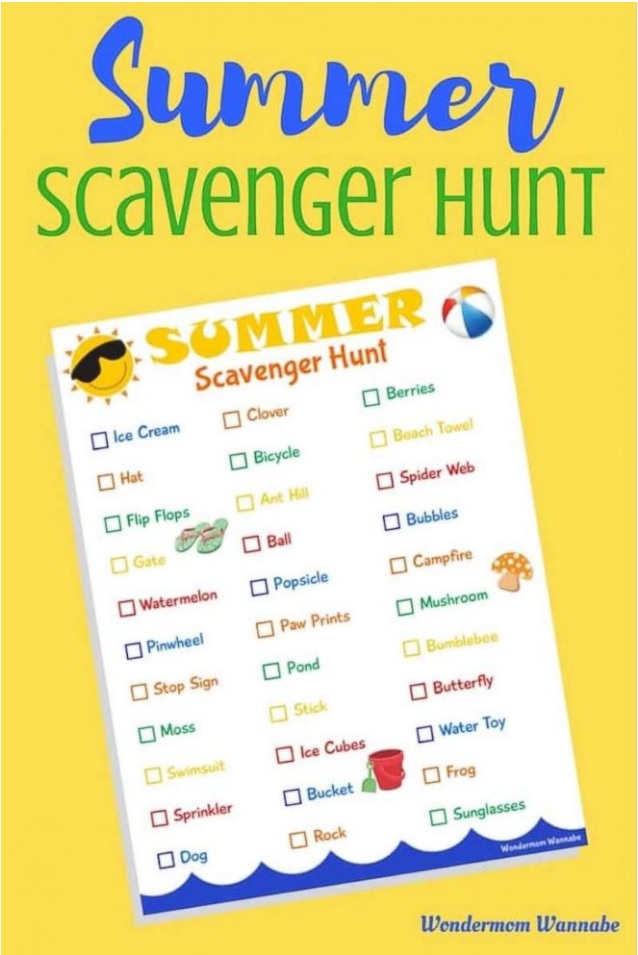 No kid will ever say no to a scavenger hunt. Hide objects and clues both outdoors and in and set a timer, inspiring kids to run between spots before the timer runs out. Depending on the age of the kids, give them 10, 15 or 20 minutes to complete a "summer scavenger hunt." Bonus if there's some sort of prize payoff at the end -- like a trip to the park or beach to use their findings. This adorable print-out is from WonderMomWannabe.com.
