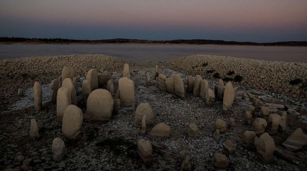 The dolmen of Guadalperal, also known as the Spanish Stonehenge, is revealed due to the receding waters of the Valdecanas reservoir in the outskirts of El Gordo, Spain, Aug, 3, 2022.
