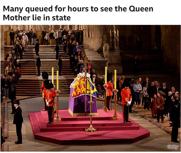 The last member of the Royal Family to lie in state in the hall was the Queen Mother in 2002, when more than 200,000 people queued to view her coffin.