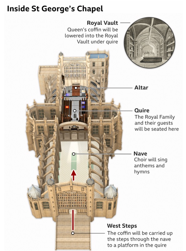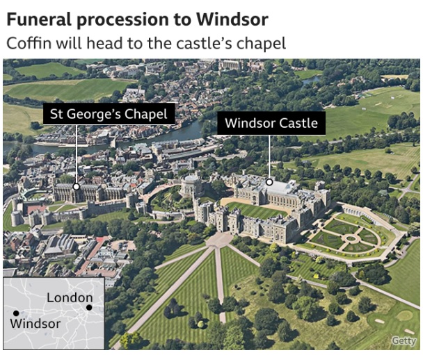 The Queen's coffin will make its final journey that afternoon to St George's Chapel in Windsor Castle.