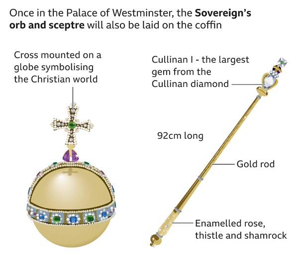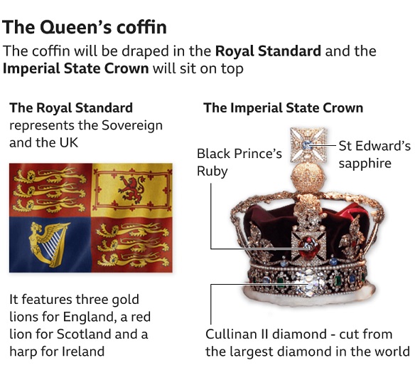 Her coffin will be draped in the Royal Standard and once in Westminster Hall it will be topped with the Imperial State Crown, orb and sceptre.